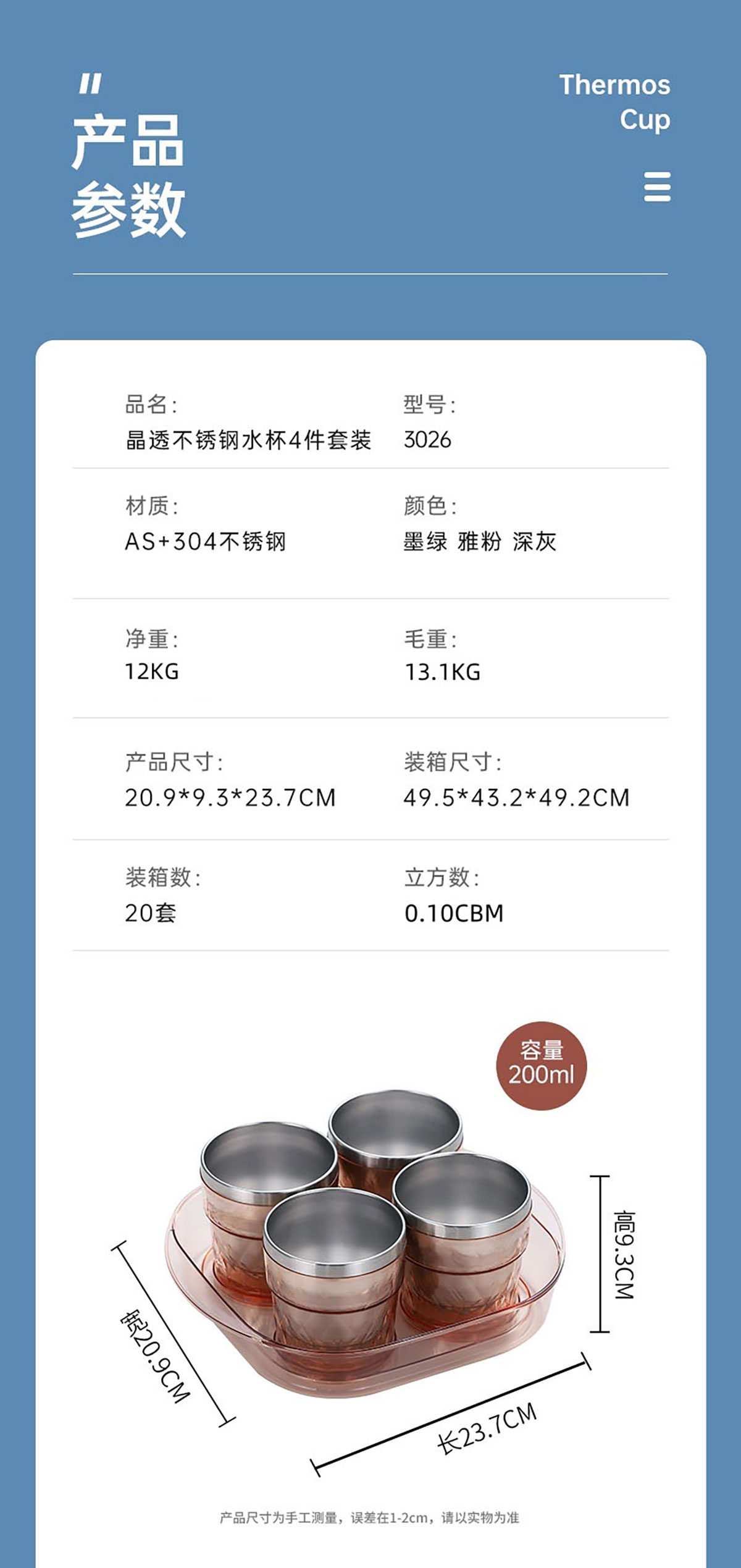 Size: 209*93*237mm/單個水杯:85*91mm/200ml