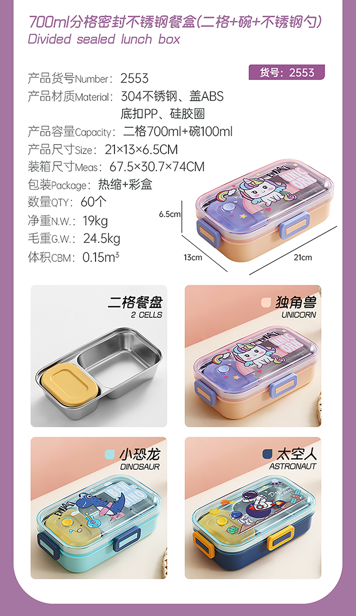 700ml萌趣密封不銹鋼餐盒(卡通單格/二格/二格+碗100ml+不銹鋼勺)