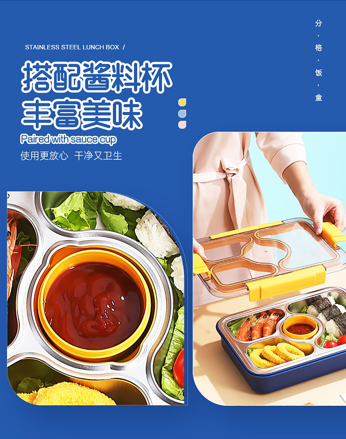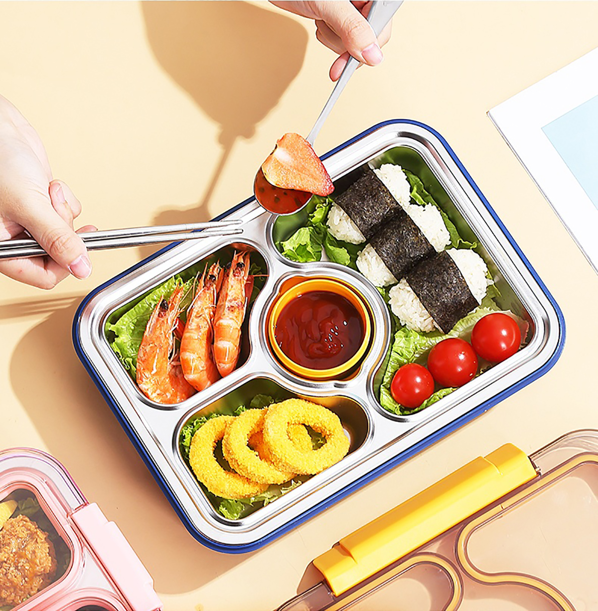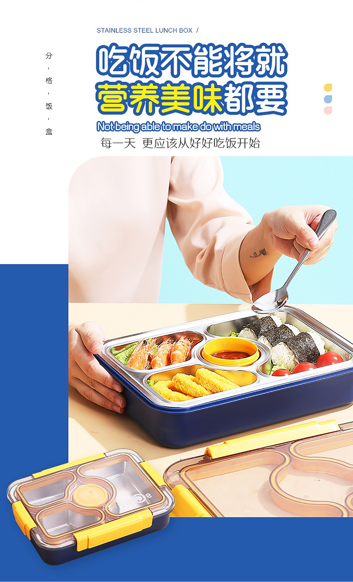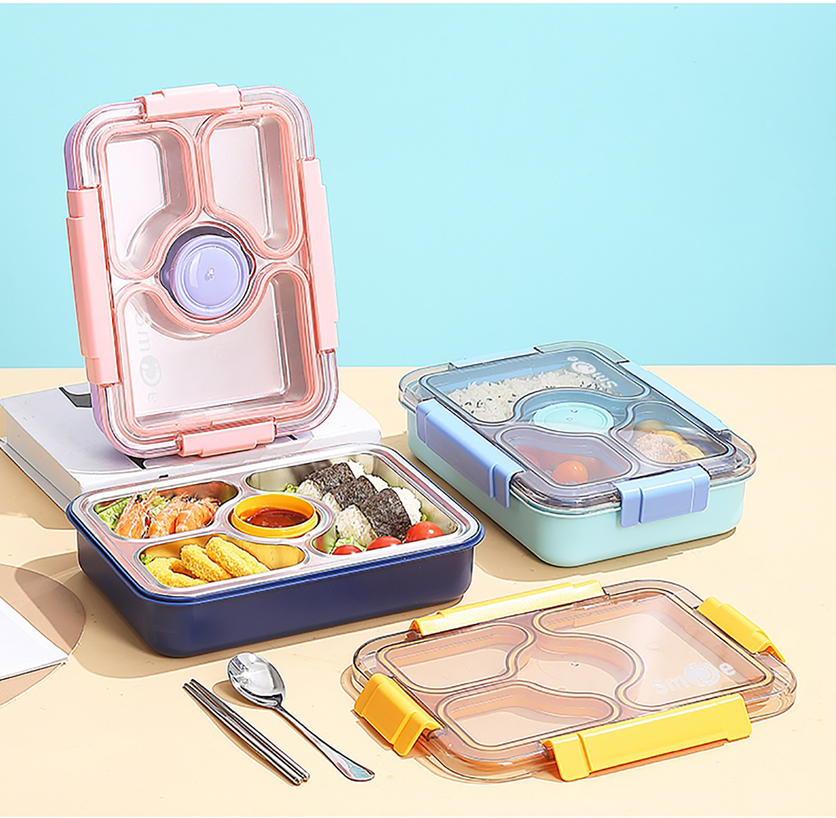 950ml獨(dú)立密封不銹鋼餐盒(3格+PP碗80ml+不銹鋼勺筷)