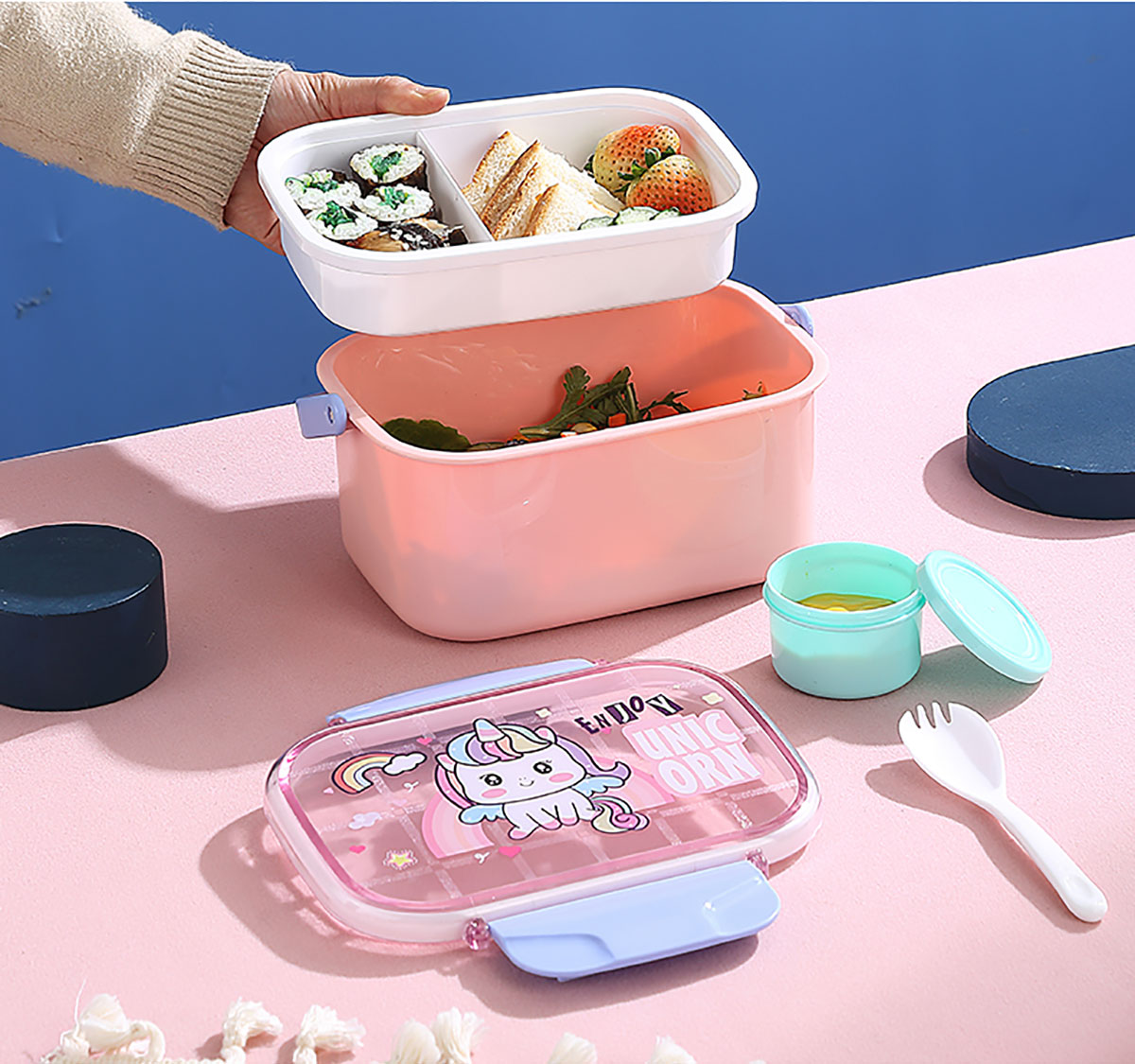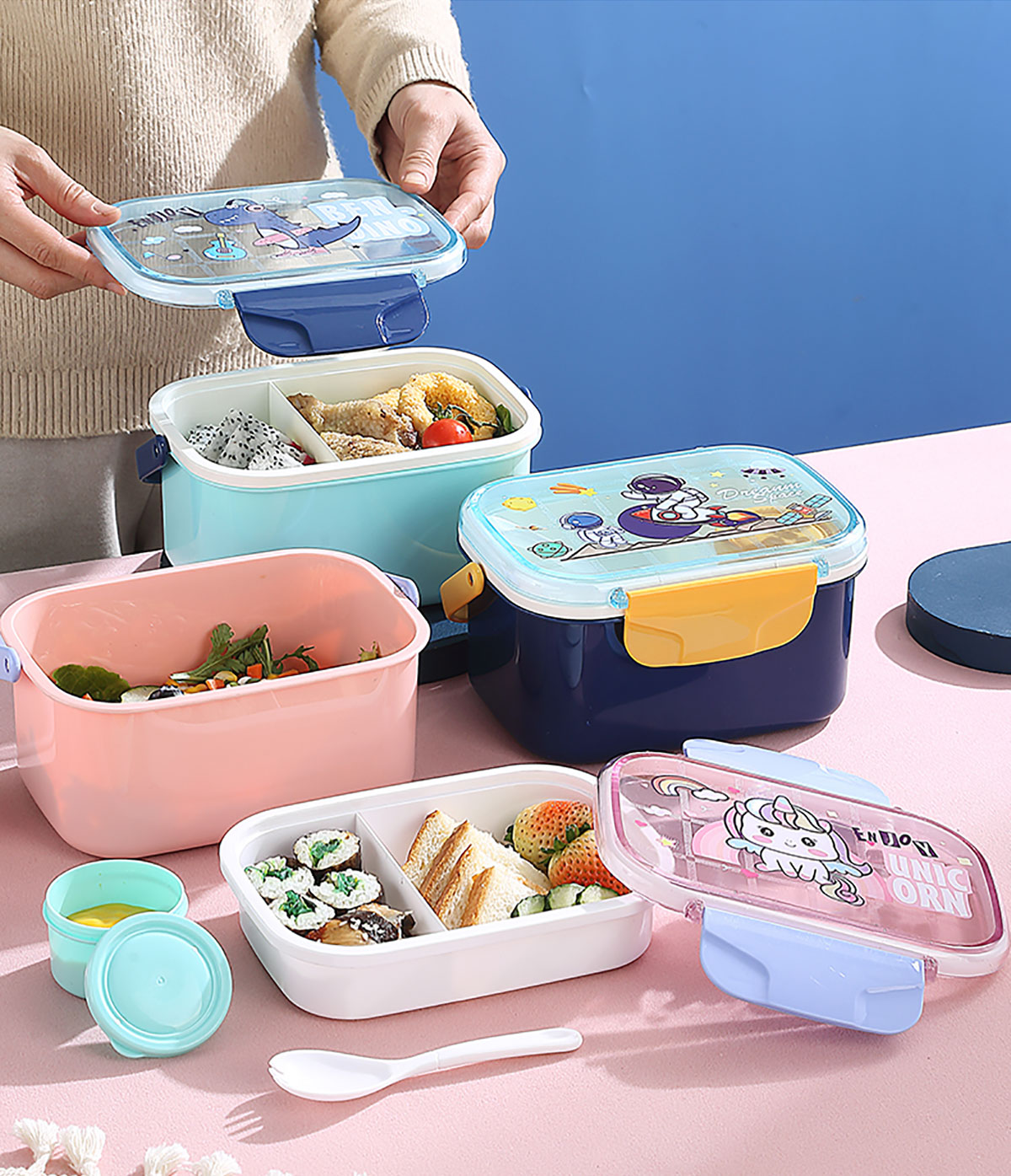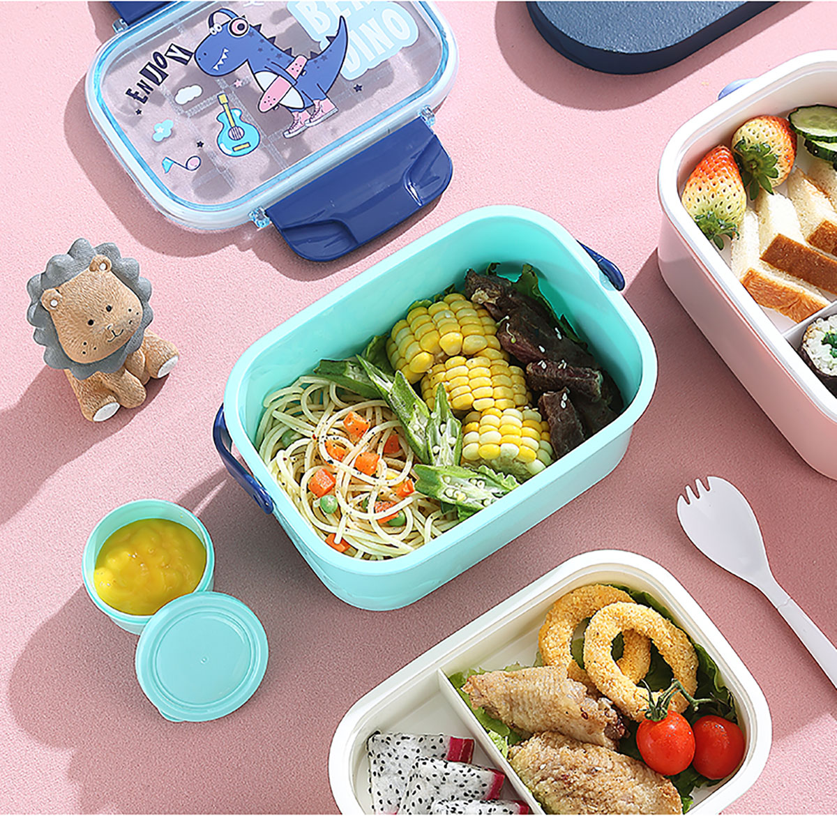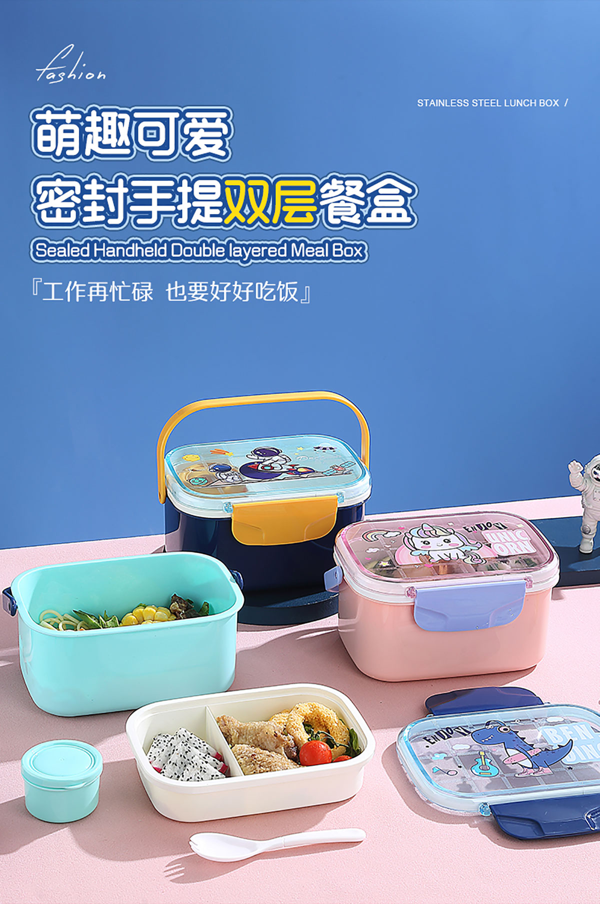 萌趣密封手提雙層餐盒(1600ml+沙拉杯80ml+PP勺子)