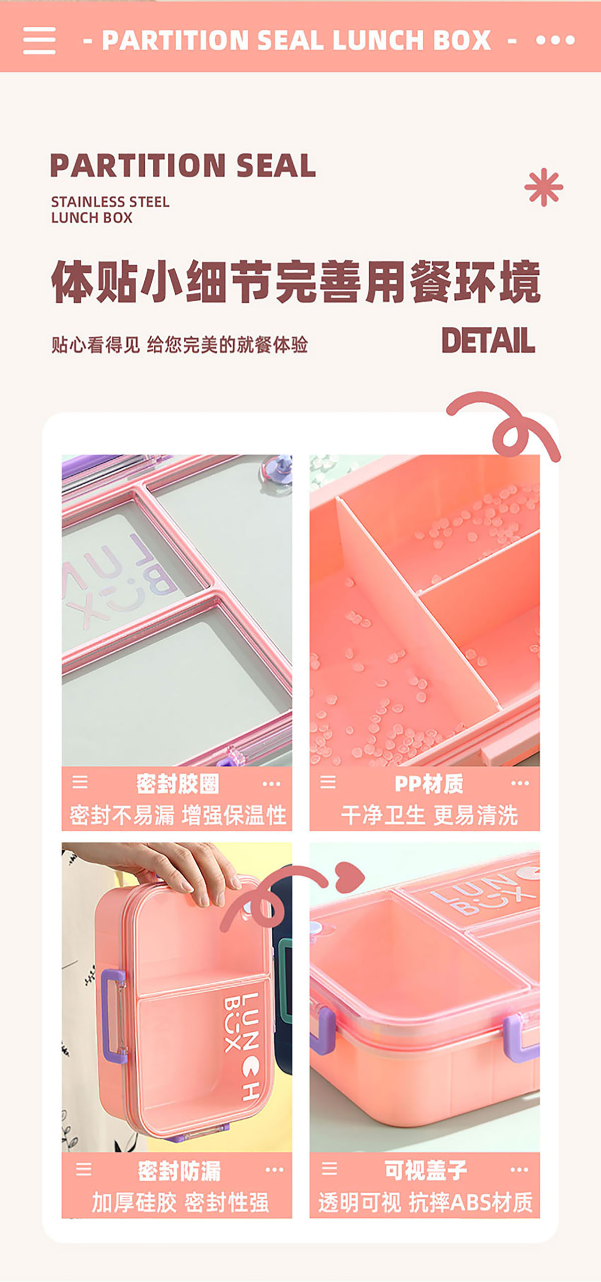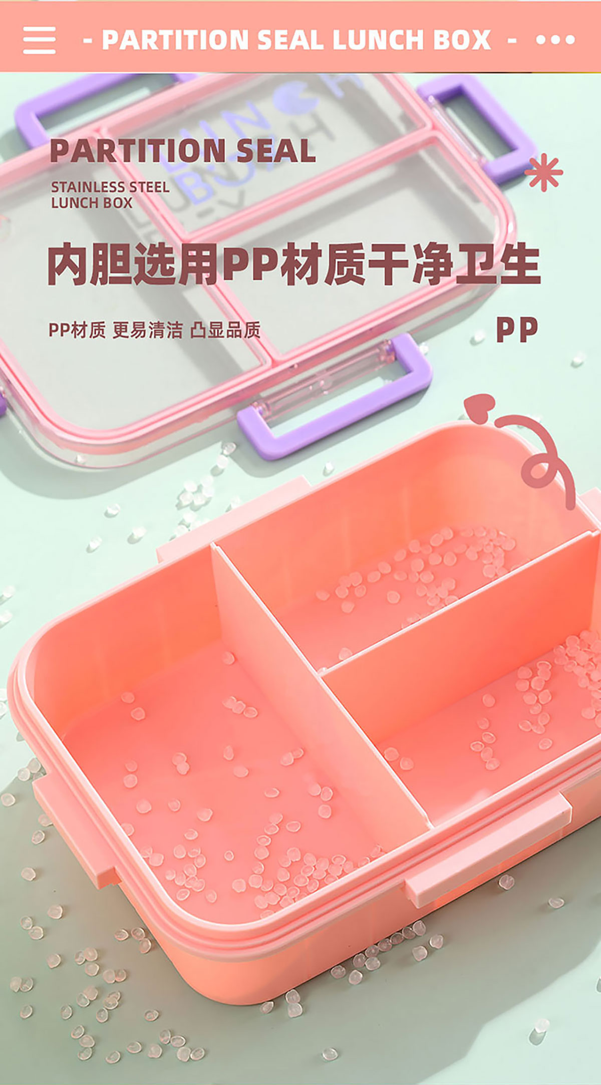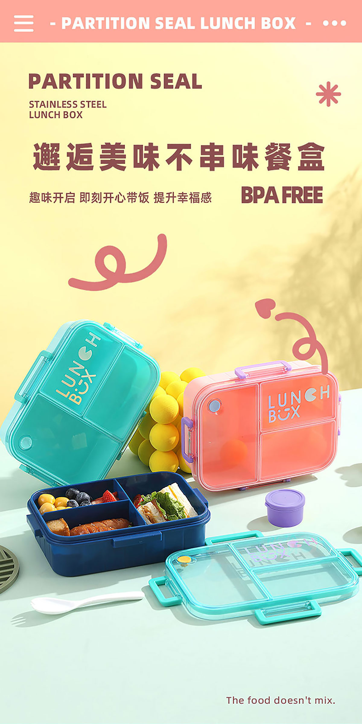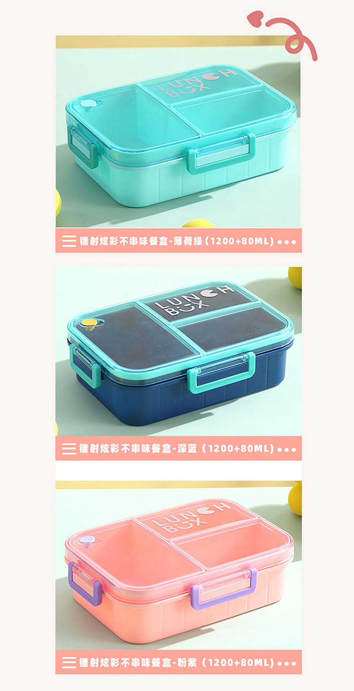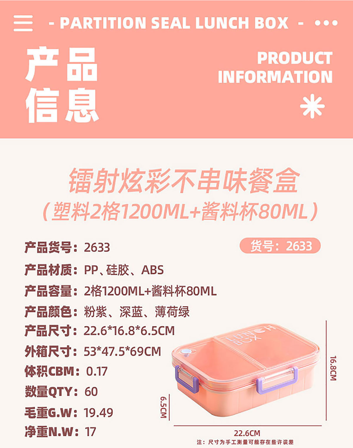 Size: AQX-2633:226*168*65mm/塑料2格1200ml+醬料杯80ml AQX-2634:226*168*65mm/塑料3格1200ml+醬料杯80ml